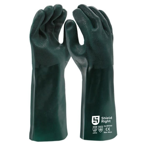 View full detailsShield Right Double Dipped Green PVC Gloves are designed for heavy-duty applications requiring enhanced grip, chemical resistance, and extended pro...